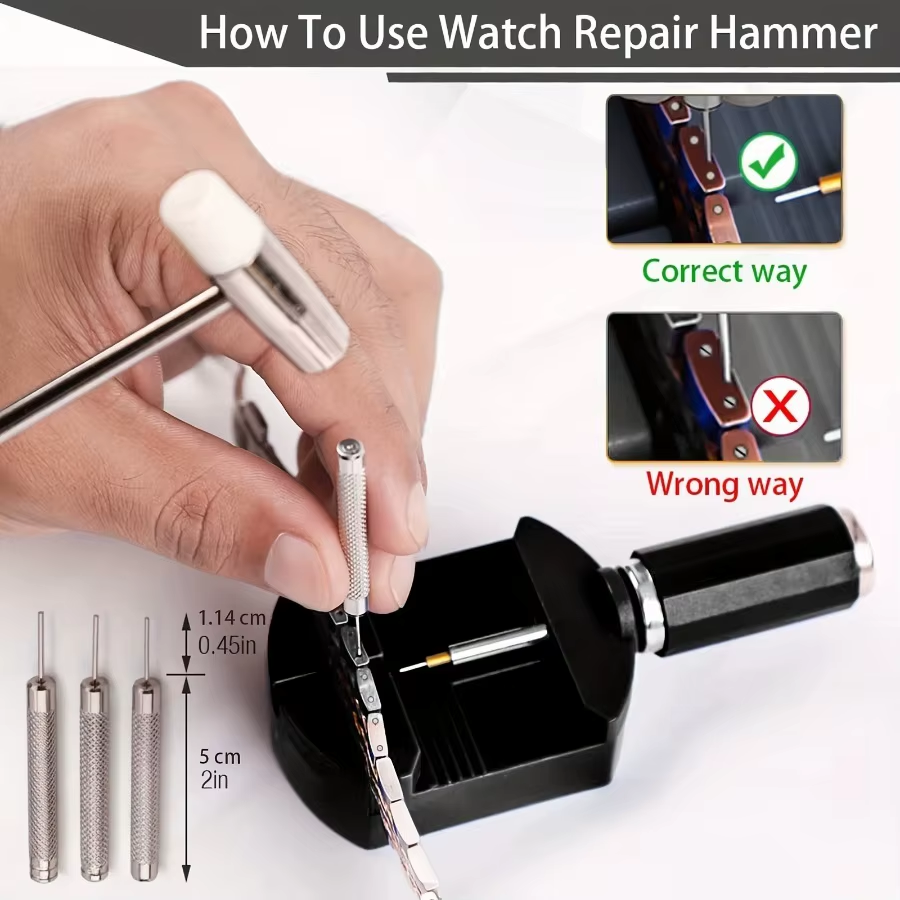 This kit includes a watch link removal tool, 5 extra pins, 3 pin punches of varying sizes, a watch hammer, and spring bars. It provides everything needed for removing links on watches, watch strap link removal, and bracelet adjustments. Handle broken or oversized straps without visiting a repair shop.