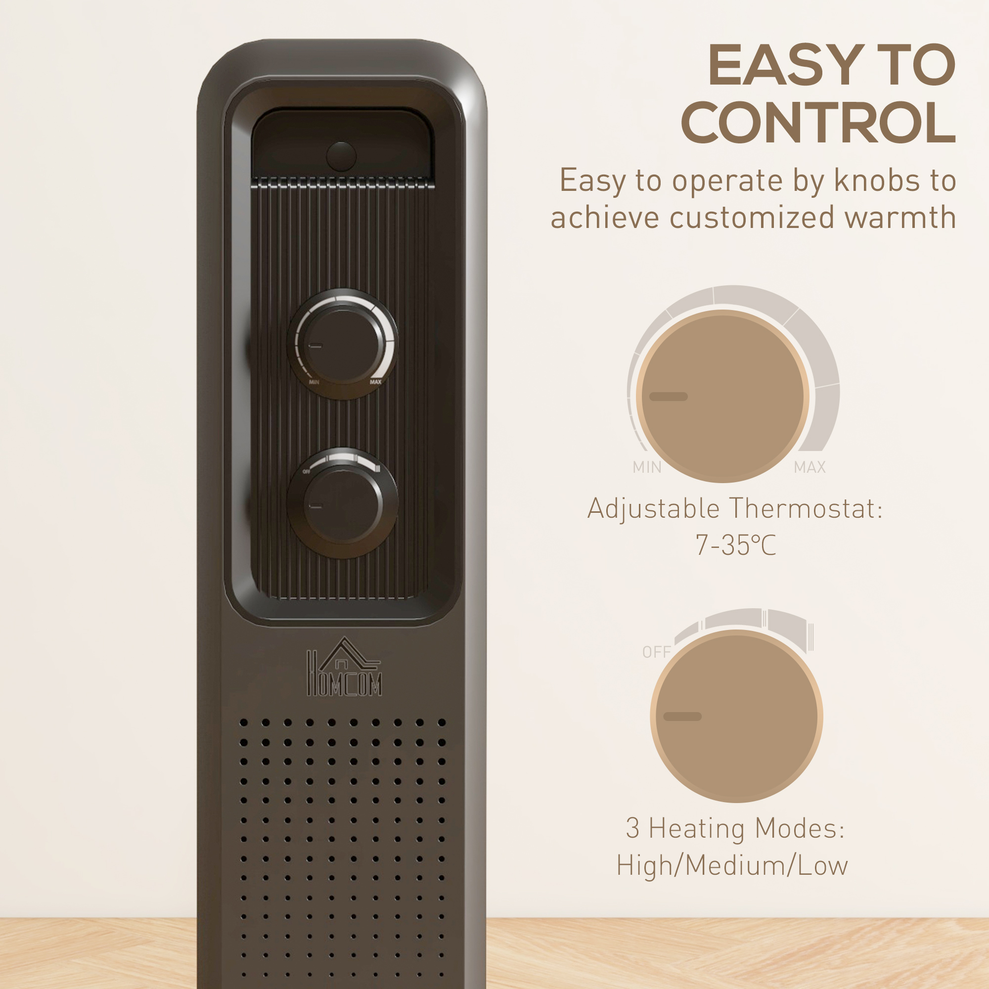Keep warm with this oil filled radiator from . With an adjustable temperature of 7-35℃ and three heating modes, you’re in control of the heat you want. The overheating and tip-over function will turn it off safely, so you can enjoy this portable radiator with peace of mind. Move with minimum fuss using the wheels and handle, making sure no room goes cold. It’s complete with a cable organizer for tidiness. Get a cosy winter by electric radiator.